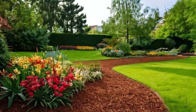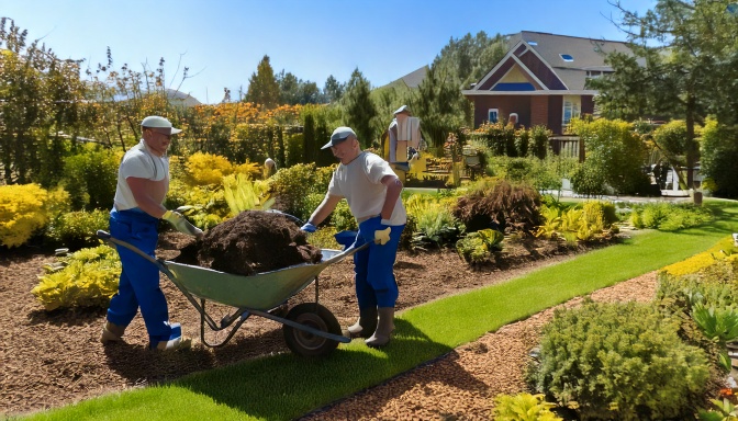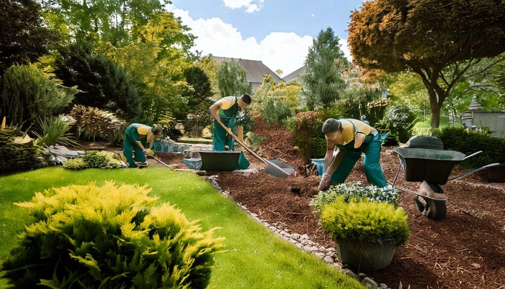 - Application of mulch (organic, decorative, or bark-based) around flower beds and trees